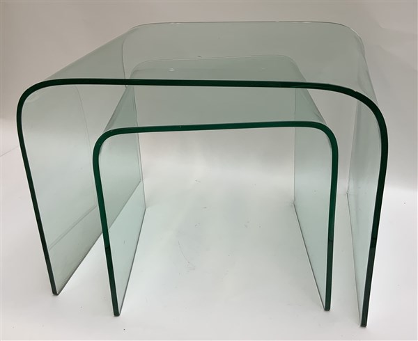 Coppia di tavolini. Milano, fine anni '80. Cristallo di forte spessore curvato e molato. (tavolino grande cm 60x45x50; tavolino piccolo cm 39x38x40) (lievi difetti)
