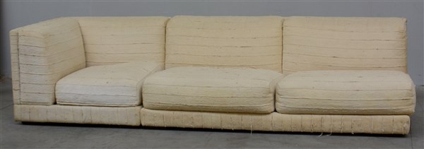 Lotto composto da un divano a due posti e una poltrona angolare con seduta e schienale imbottiti e rivestiti in tessuto beige. Produzione Molli, Roma, anni '70/'80. (divano cm 188x72x98; poltrona cm 98x72x98) (difetti)
