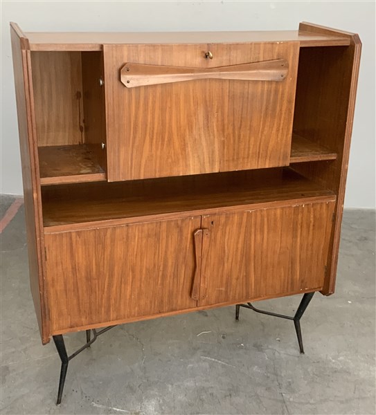 Mobile bar in legno multistrato, bordato e impiallacciato con parte inferiore a due ante, parte superiore con stipo centrale con apertura a ribalta e due ripiani laterali a giorno. Gambe in metallo, maniglie in legno sagomato. Italia, anni '50/'60. (cm 119x140x45) (difetti)
