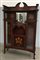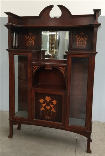 Libreria in legno di mogano decorata ad intarsi floreali, due ante laterali a vetrina, parte centrale con antina, scomparto e specchiera. Secolo XX.