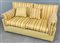 Divano a due posti rivestito in tessuto giallo, seduta e schienale imbottiti e rivestiti in tessuto a righe gialle, ocra e beige unito a due cuscini. Italia, produzione recente. (cm 145x70x82) (difetti)