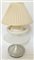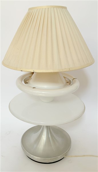 Lampada da tavolo con luce al neon, fusto in alluminio satinato, paralume in stoffa plissettata. Italia, secolo XX. Recante etichetta adesiva del produttore. (h cm 72) (difetti)