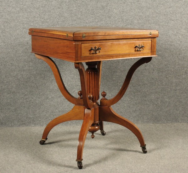 Tavolino da gioco a fazzoletto in legno di noce con gamba centrale e un...