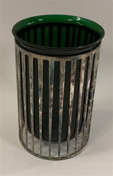 Vaso della serie "Palafitte". Bregnano, 1992. Vetro soffiato trasparente color verde, supporto in ottone argentato. Marchiato "SABATTINI MADE IN ITALY". (h cm 16,5; d cm 10,5)