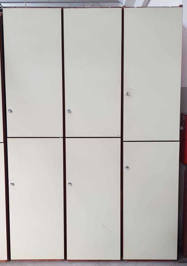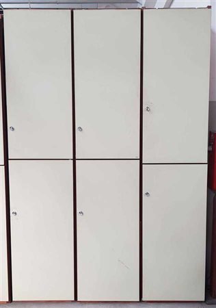 Armadio componibile ad incasso a tre moduli e sei ante modello "A57". Produzione Tecno, Varedo, 1957. Legno impiallacciato con fronte verniciato e maniglie in metallo. (cm 197x289x65) (difetti)