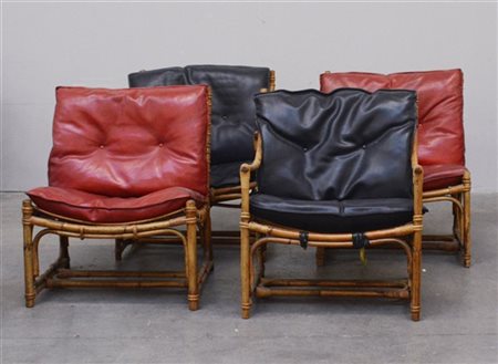 Lotto composto da quattro poltrone in giunco e malacca di cui due con braccioli. Italia, anni '60. (cm 64x78x70) (gravi difetti e mancanze)