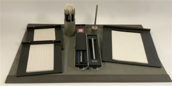Lotto composto da un sottomano in alcantara, due segnanote con penna, un segnaposto per tavolo riunioni, un fermapenna con penna in ottone nichelato e un portapenna in ottone nichelato con penne nere e in ottone nichelato. Produzione Cini & Nils, Milano, anni '80. Unito a una penna Aurora Hastil del 1970 disegnata da Marco Zanuso in astuccio originale. (lievi difetti)