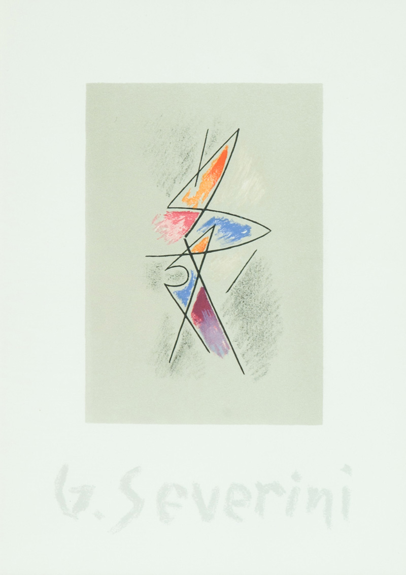 Gino Severini Senza titolo Litografia su carta, cm. 49,5x37 L'Opera fa parte della cartella "6 litografie di Severini", con presentazione di Carlo Ludovico Raghianti e Giovanni Caradente. Stampatore Rodolfo Margheri, Firenze. Editore il Bisonte, Firenze. Tiratura: 135 es. numeri arabi (100 es. con firma disegnata "G. Severini" + 35 es. firmati a lapis dalla figlia di Severini dopo la sua morte). Firma "G. Severini", stampata in basso al centro. Bibliografia: Francesco Meloni, "Gino Severini tutta l'Opera Grafica", editore Libreria Prandi, Reggio Emilia, pag. 104-105.