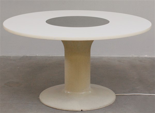 Tavolo da pranzo con piano circolare e parte centrale riscaldabile. Struttura in laminato bianco, plastica e metallo. Anni '70/'80. (h cm 75,5; d cm 139) (difetti)
