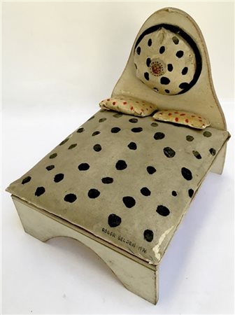 Roger Selden Letto, 1976 scultura in legno e tessuto cm 27x 26.5x23 firmato e da