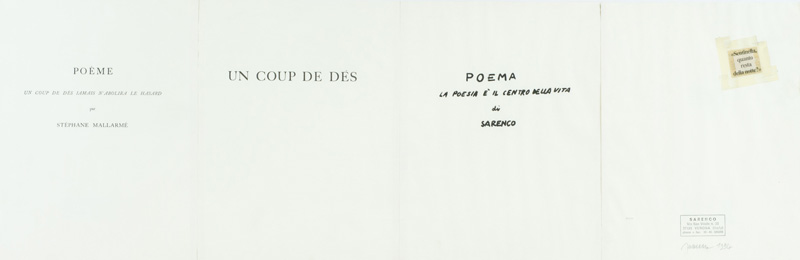 Sarenco (Isaia Mabellini) Poeme, 1994 Tecnica mista su carta, cm. 32x98,5 Firma e data in basso a destra. Sul verso: etichetta "Nuovo Millennio", Bs, con descrizione. Autentica dell'Artista su foto.
