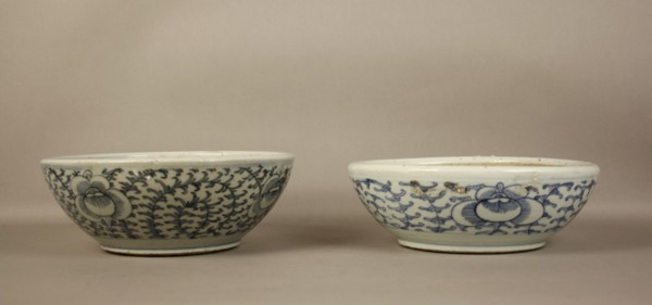 Firmato, datato. Due ciotole in porcellana smaltata bianca e blu. Cina. Fine...
