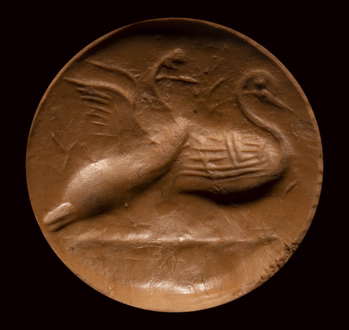 A lentoid-shape seal with two swans turned on the left. Wings spread. Groundline. Wear marks.
