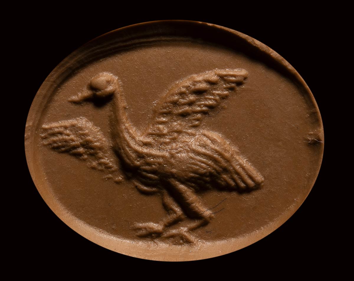 The bird is turned on the right, wings spread. Convex backside. Wear marks. Rare.