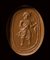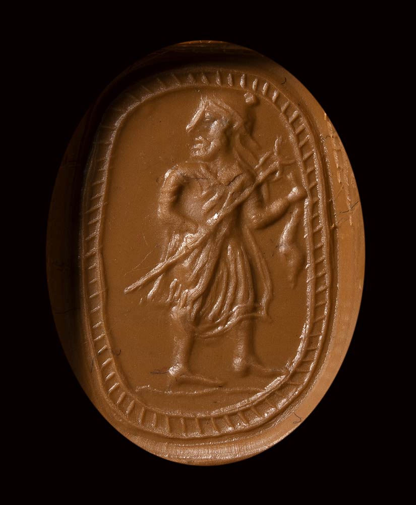 The character can be identified as Hermes. The god is standing, the body turned on the left meanwhile his head is reversed on the right. He holds the caduceus in his left hand, and the purse in the right one. Clothes and hat in oriental style. Groundline. Cable border. For the mounting; hoop angular on the outside ending with small convex discs with agate scarab revolving on a wire swivel passing through the disks and twisted around the ends of the hoop. The stone is drilled lenghtwise and filled with gold.