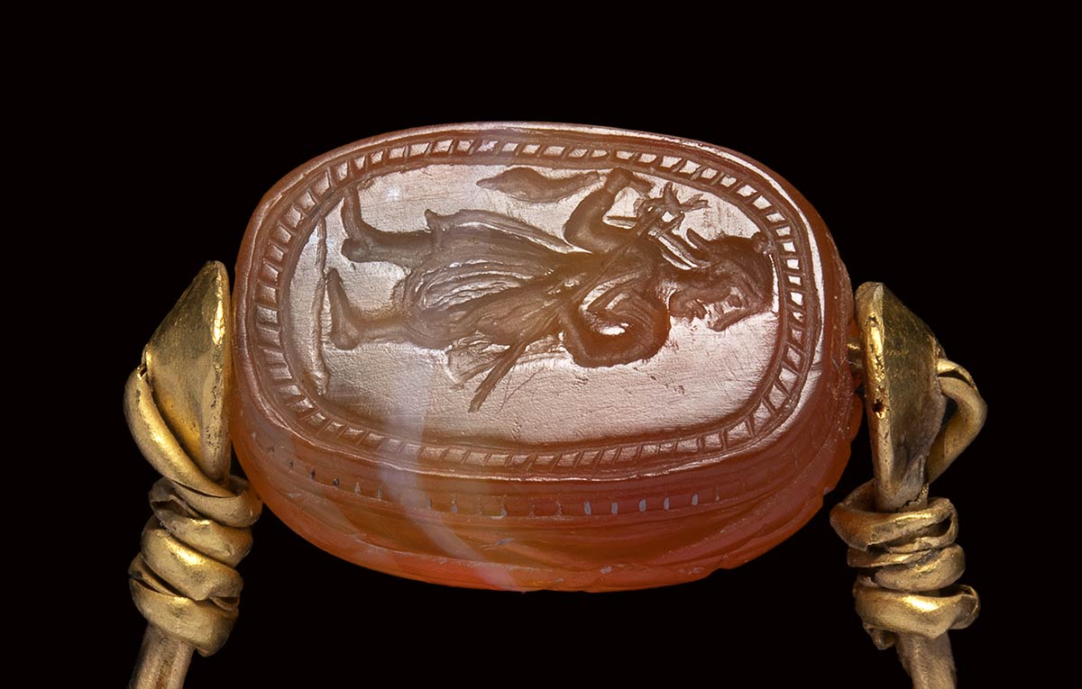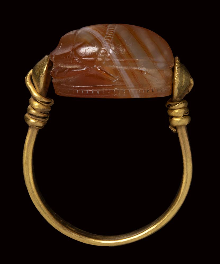 An etruscan agate scarab intaglio, mounted on an ancient gold ring. Hermes.