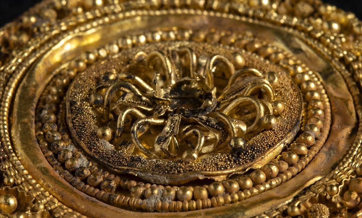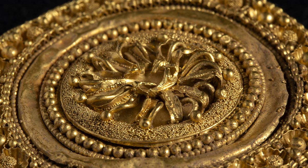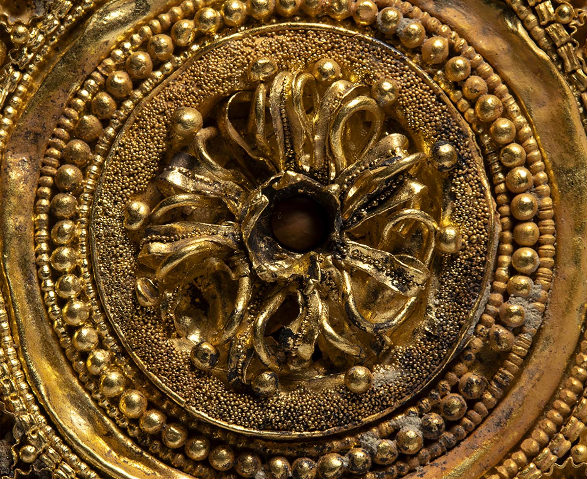 The disks are formed of a circular gold sheet, the outer surface of which has a central floral element composed of radiated leaves of gold, each bearing granules at its top, and background in granulation. Three concentric bands encircle the floral: