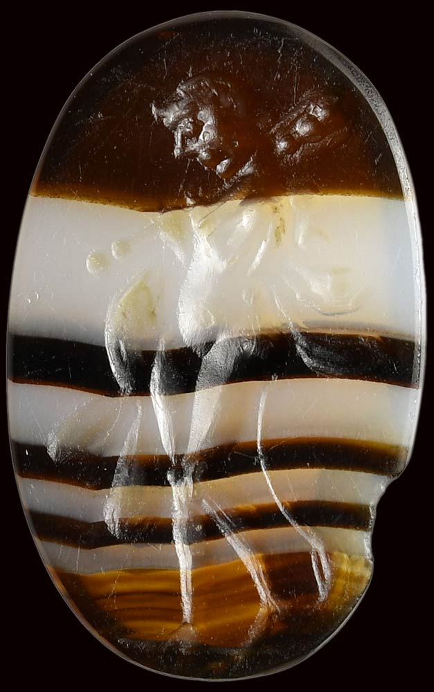 The mythological figure is turned to the left, and supports the heavy club of Hercules on his delicate shoulders. Her naked body, depicted in her typical sensual pose, is partially protected by the leontea. Use of globular elements. Intaglio executed with technical skill and excellent composition.Extraordinary varity of banded agate, characterized by vivid colors. Slight wear marks. Chipping on the edge.