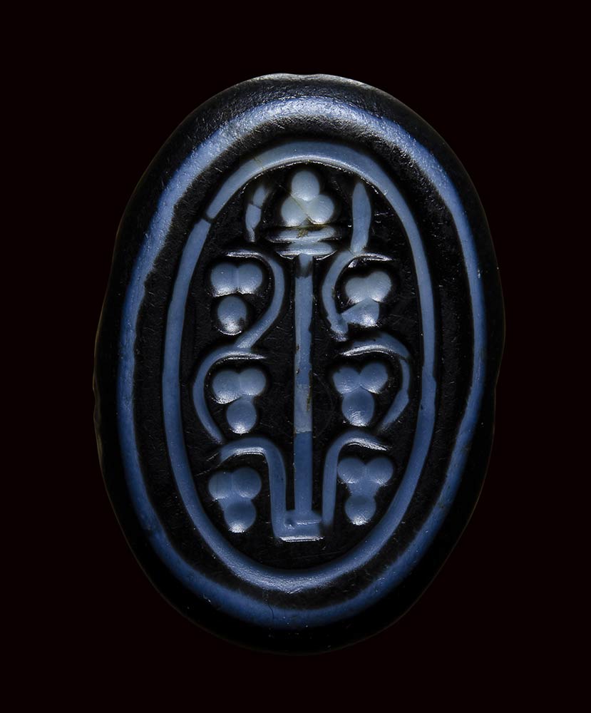The representation is characterized by a stylized and symmetrical emblem structure, depicting racemes of grapes with bunches; in the center, probably a thyrsus or a scepter referable to the Dionysiac sphere. The unusual composition is known from some rare specimens, probably referable to eastern regions. Attractive variety of stone, finely engraved. The back has a chipped surface.