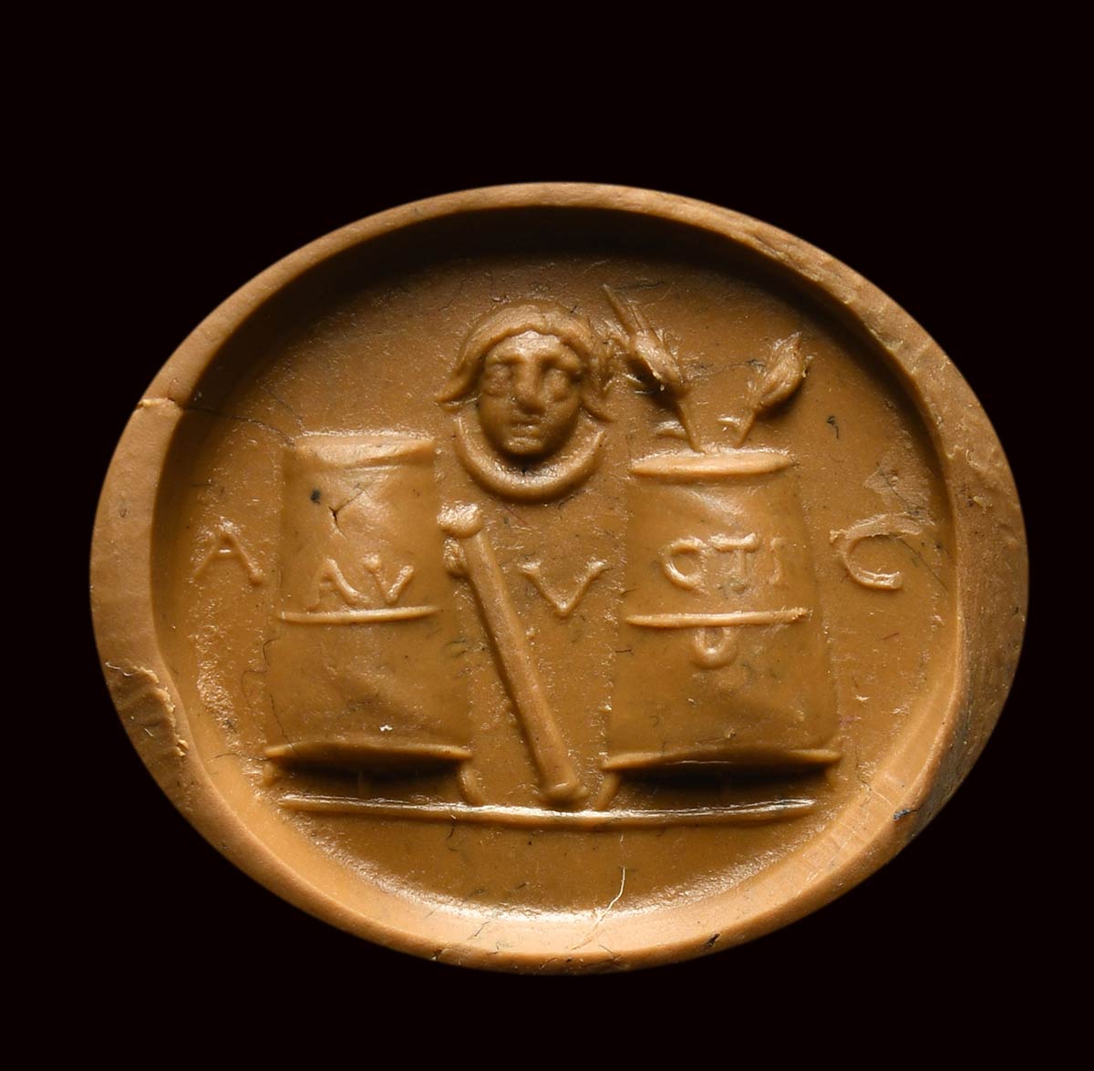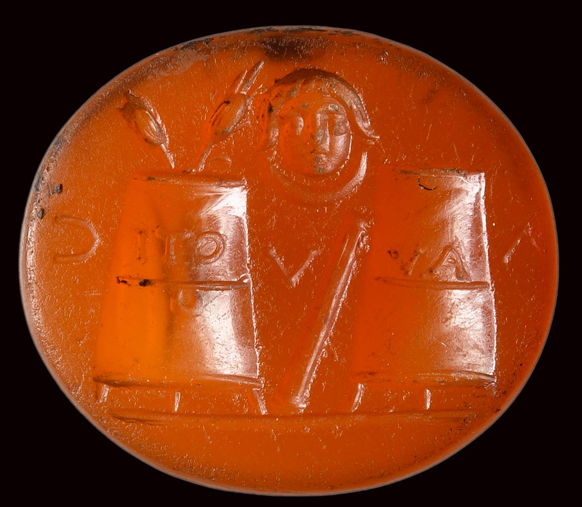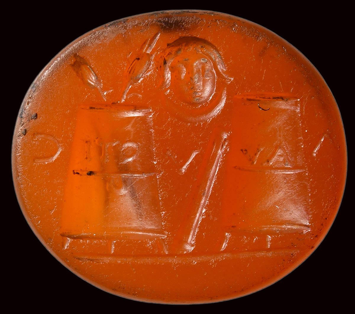 Unusual allegorical emblem, executed with great skill and compositional symmetry. The subject is probably referred to a corporation. Attractive color of stone. Slight wear marks. Rare.