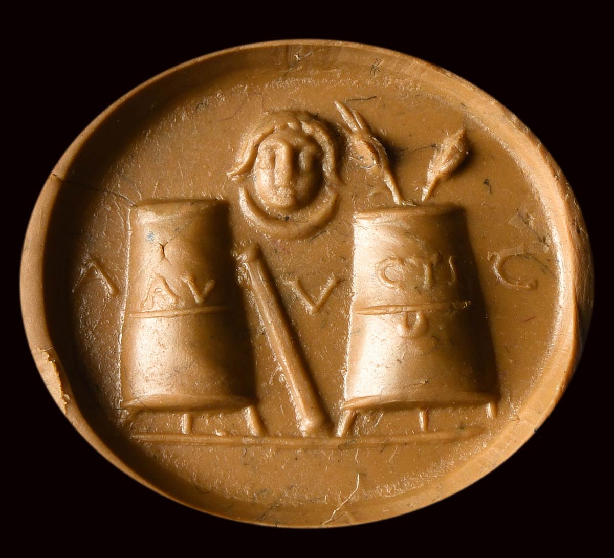 The emblematic representation is composed of two Modii, separated in the center by an instrument resting on the container on the right. Above the right container: AV; on the left container, which contains two ears of wheat: OTI.
