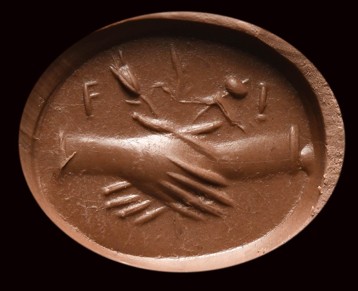 A roman carnelian intaglio. Dextrarum junctio with letters.