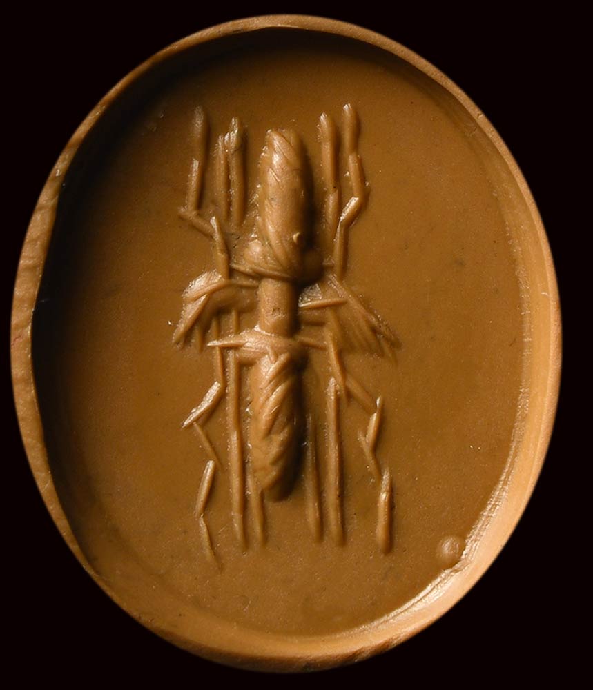 The emblematic depiction is inspired by coin issues (Divus Augustus Pater, AE dupondius - winged thunderbolts). Mirror polishing. Attractive color of the stone.