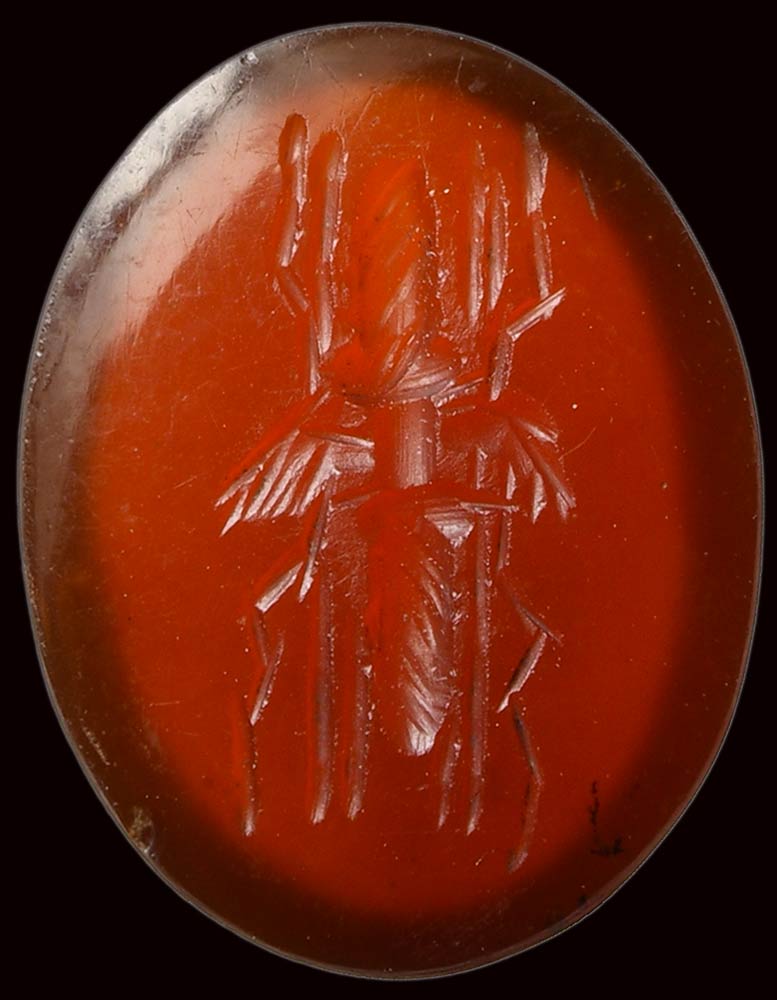 A roman deep red carnelian intaglio. Winged thunderbolt.