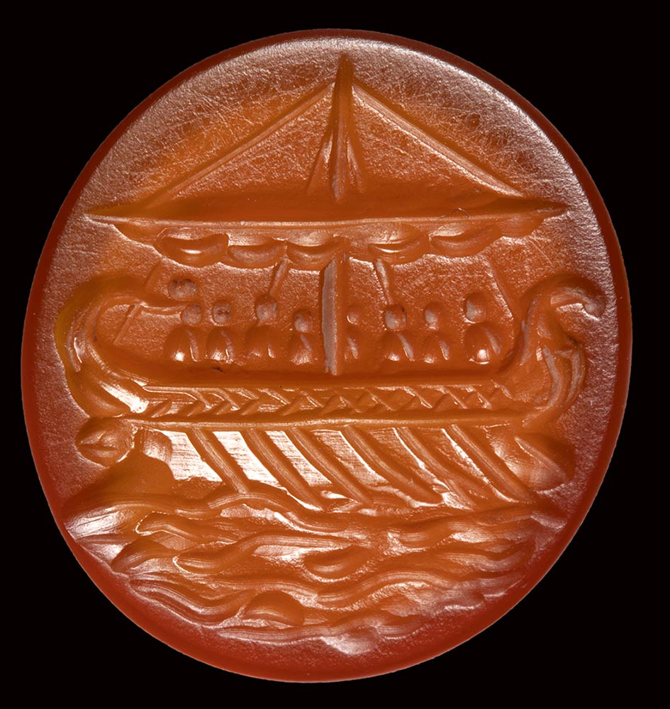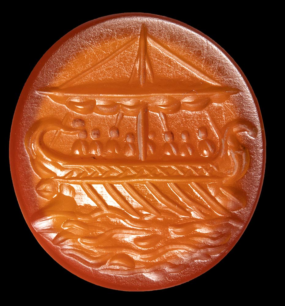A galley with eight figures holding round shields; the warship has the rostrum and the aplustre, the sail closed and the ropes pulled. Below, the waves of the sea (for a similar representation of the boat see the carnelian intaglio, Berlin, inv. FG6880). Interesting detailed work. Attractive color of the stone. Wear marks. Rare.