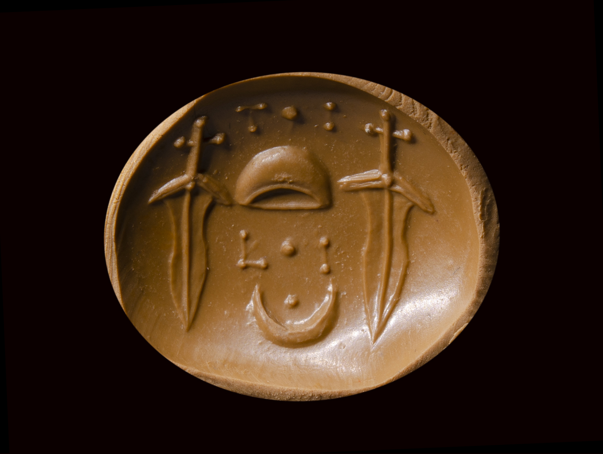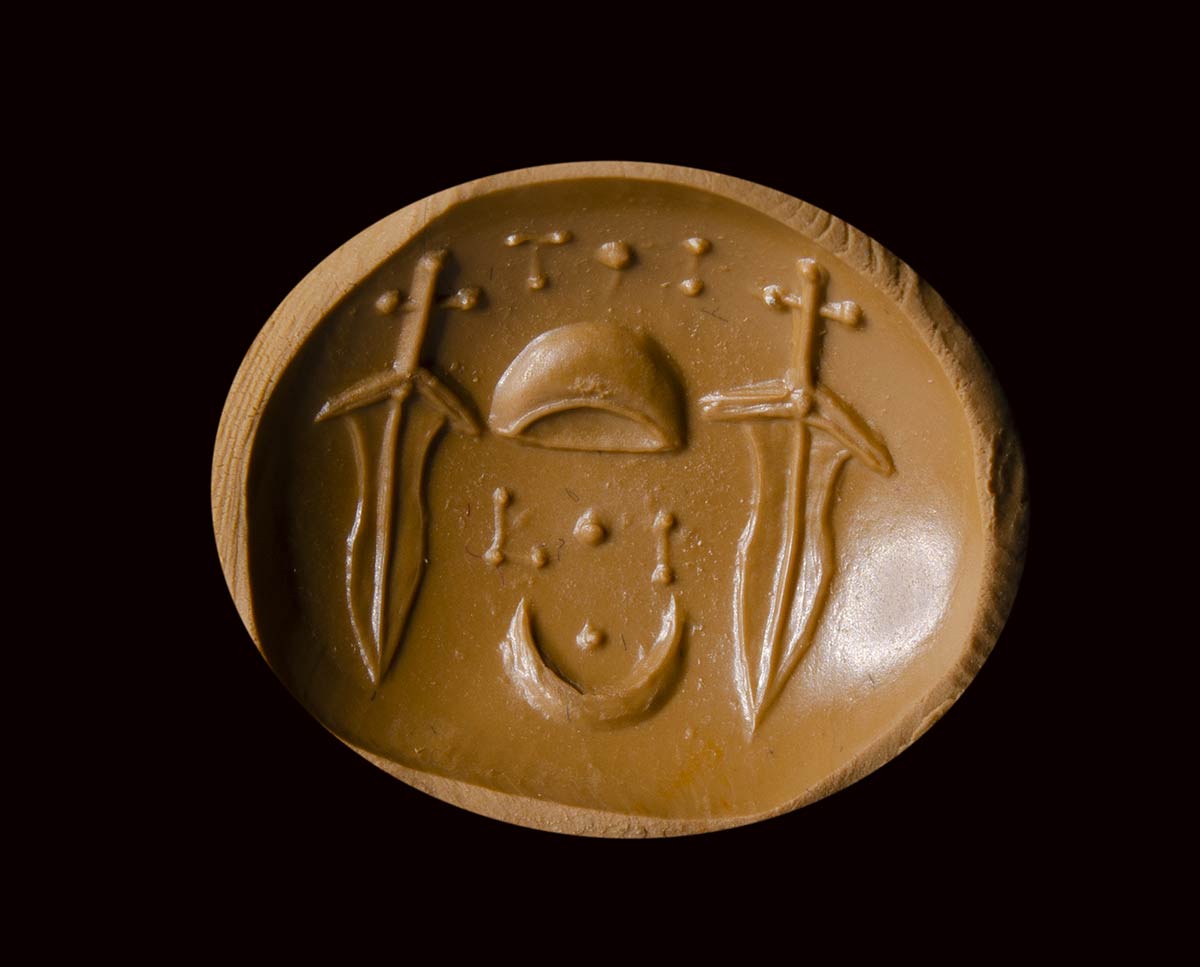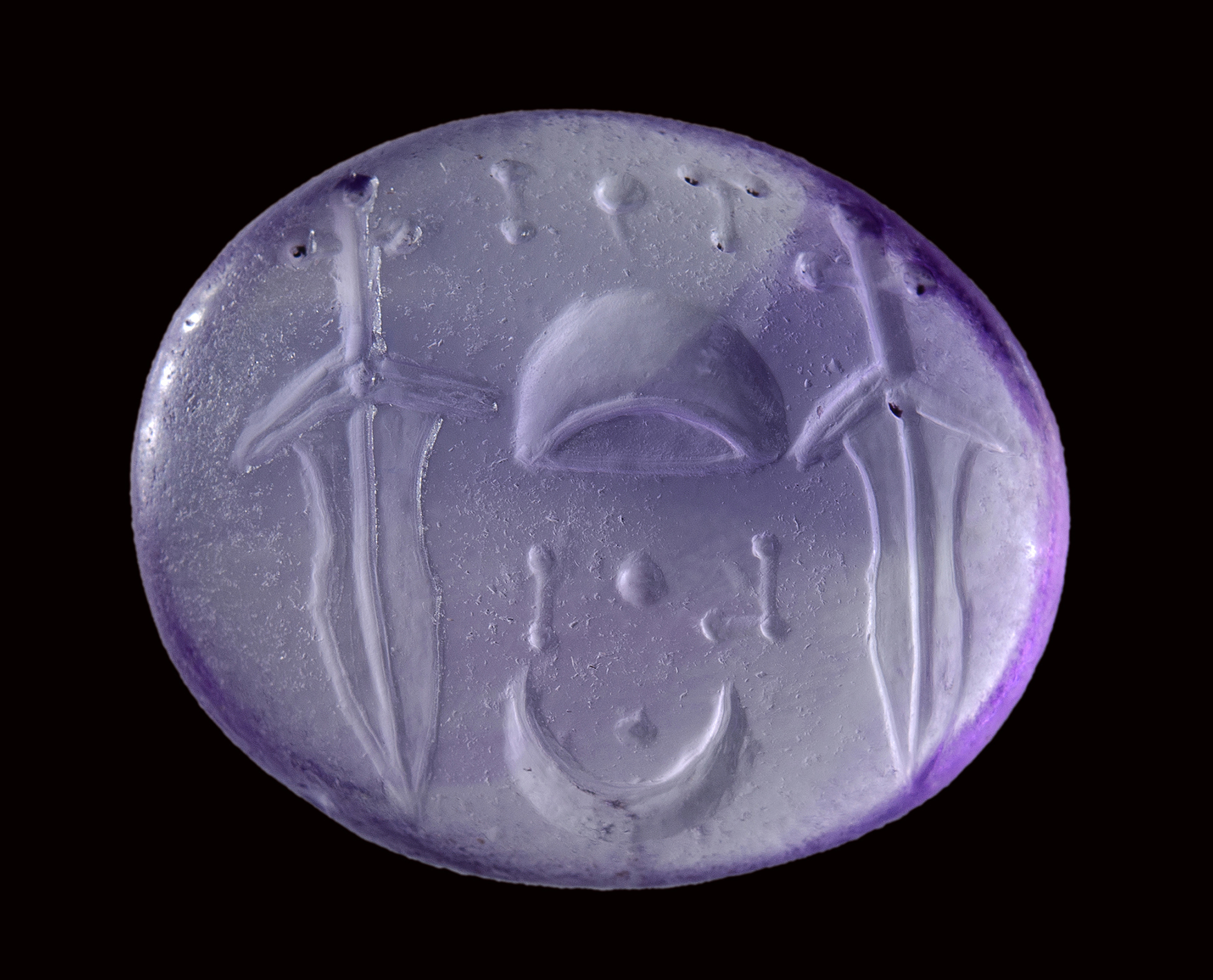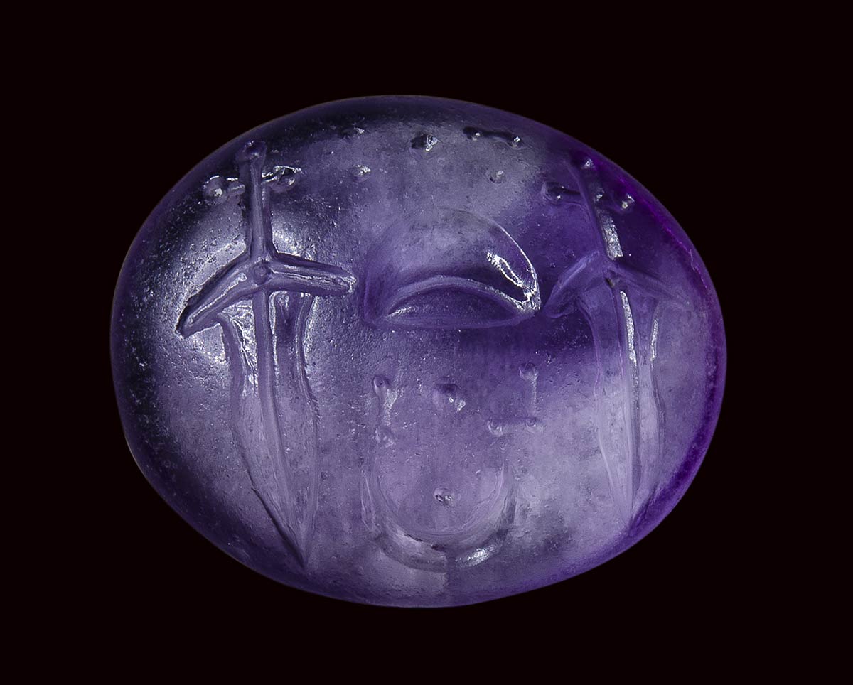 Since there is no written reference to the Ides of March as in the coins, but an unidentified name, the meaning of this emblem is not entirely identifiable, probably referable to Brutus and his tyrannicide, perhaps by one of his political follower. The presence of the moon refers to an augural, magical but also commemorative value of the stone.This intaglio is characterized by stylistic details typical of the late Roman republican style, such as the globular elements, the rendering of the letters and daggers (as in the coins), in the composition and in the shape / choice of the stone variety (a very clear amethyst, almost transparent, with dark purple shades). The gem is expertly engraved and polished (the blades of the daggers take on a sharp and deadly aspect). The stone is characterized by signs of wear on the entire surface. Rare.