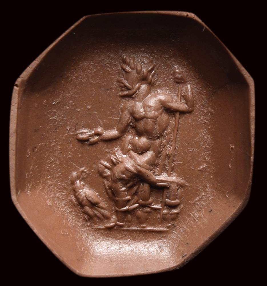 The deity is seated on a throne. With his right hand he holds the scepter, with his left he holds a patera. At his feet, the eagle. Groundline. Votive gem dedicated to the cult of Zeus, supreme ruler of Olympus. Interesting octagonal shape of the bezel. Wear marks.