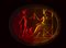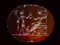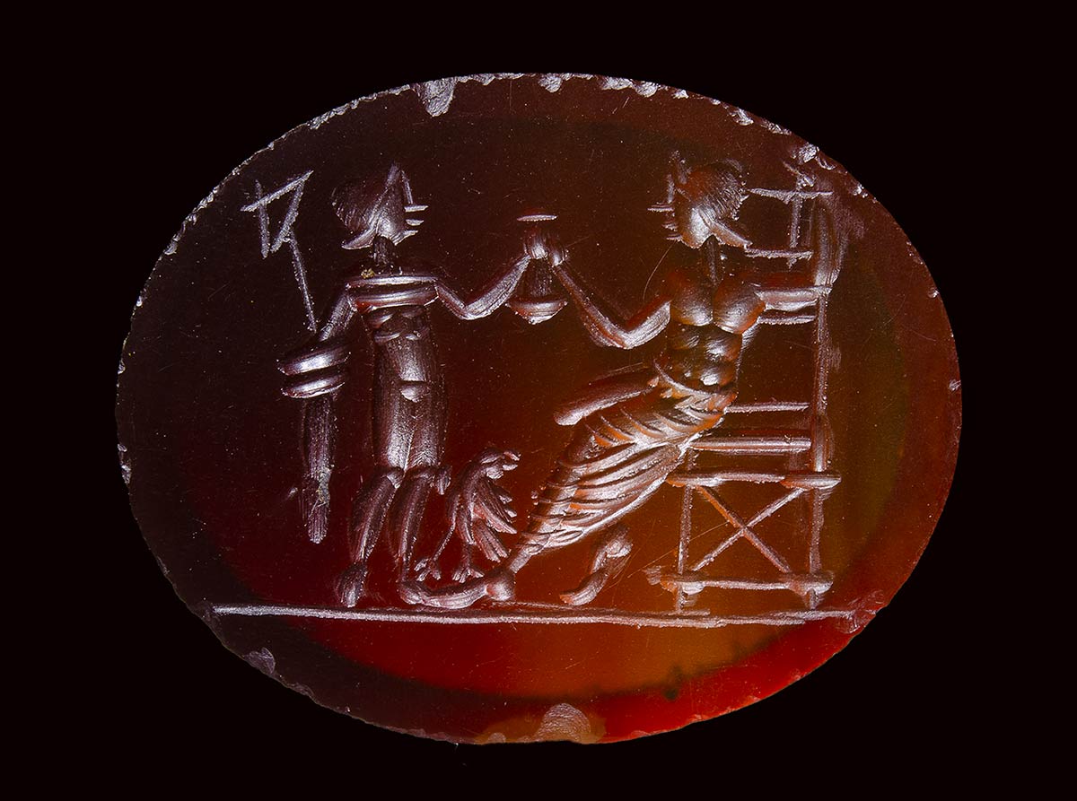 On the left side, the standing figure of Hermes is holding the caduceus and facing Zeus seated on his throne. The young god is offering a purse of money to the supreme god ( at his feet an eagle).Groundline. Probably from an eastern workshop. Small chips on the edge. Very large size. Beautiful deep red and orange color.