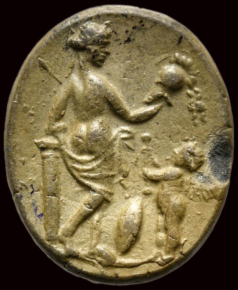 The divinity is facing right, offering the helmet to Eros with her right hand; with her left she holds a spear. The partially draped figure leans on a column. Below, a shield and winged eros holding a sword. Scene referring to the eternal victory of love and to its great power on the human beings. Interesting specimen. Chipping on th edge.