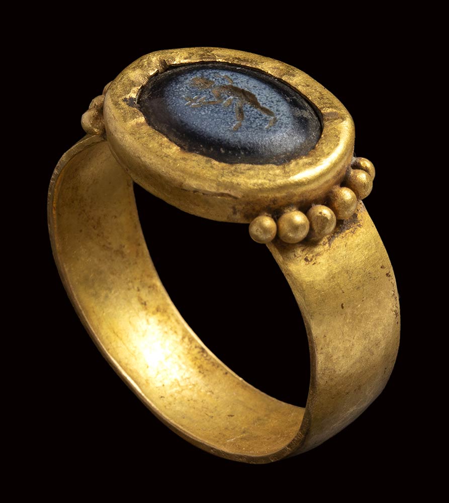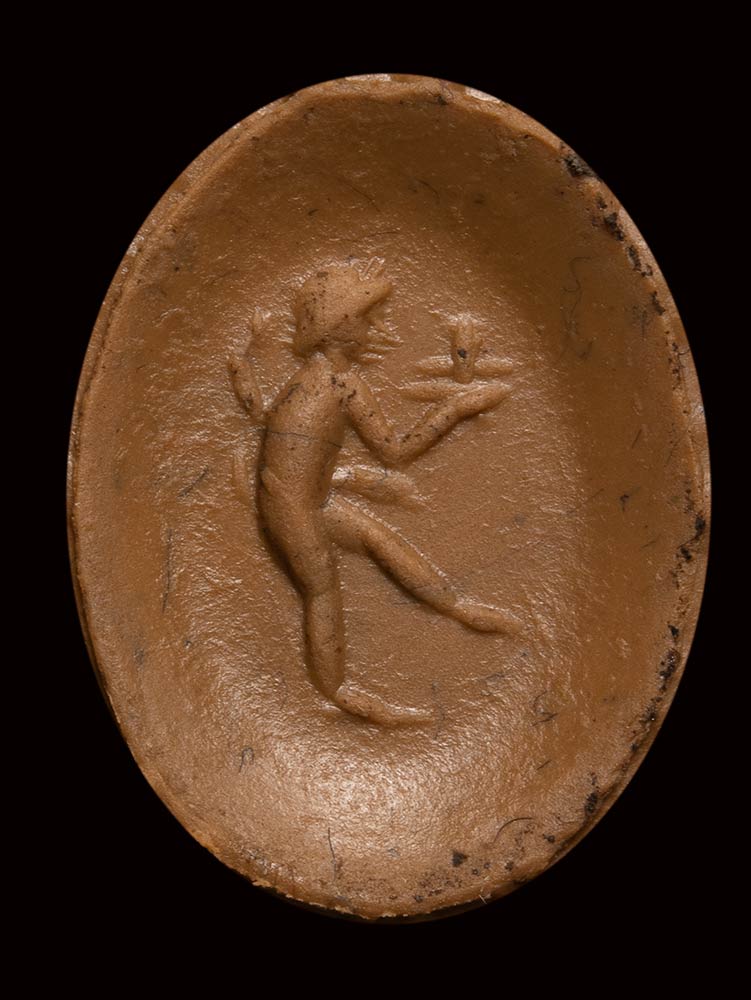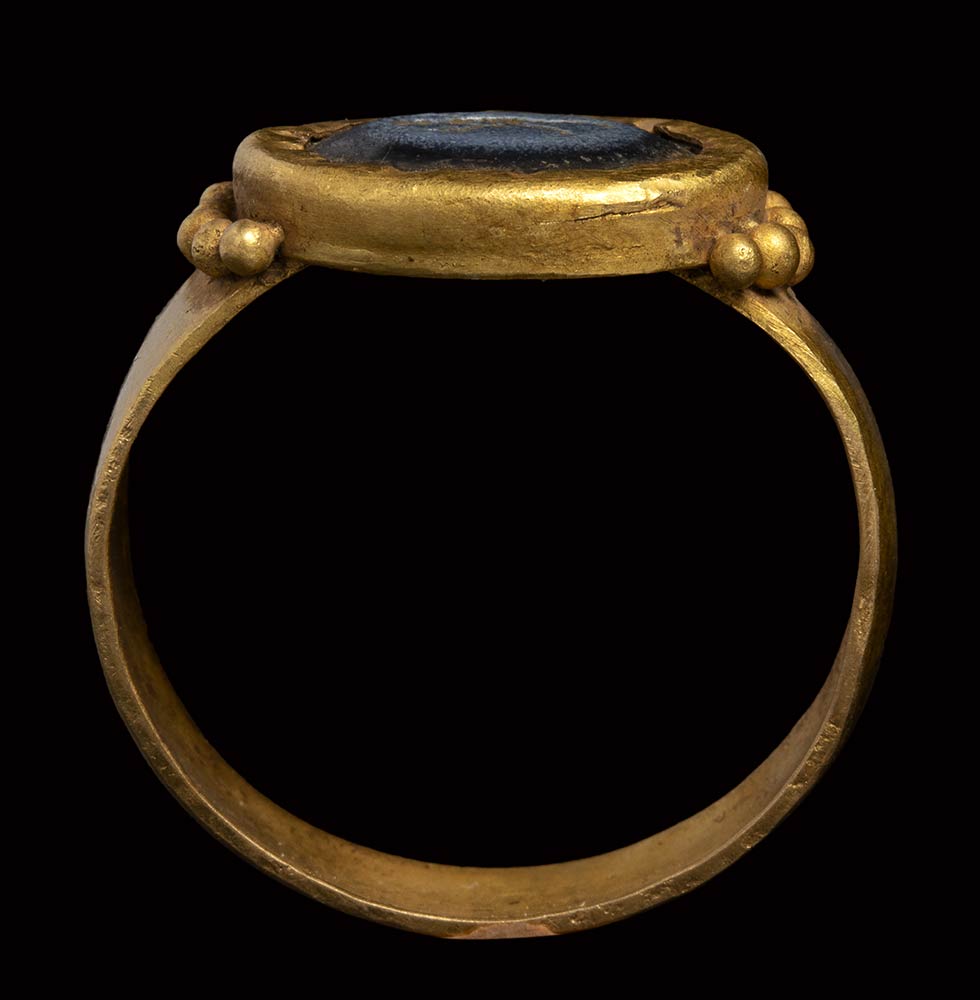 Turned on the left, holding the pedum and offerings in his left hand. The intaglio is set on a large flatten hoop, ending on an large oval bezel decorated with 6 globules on each side.