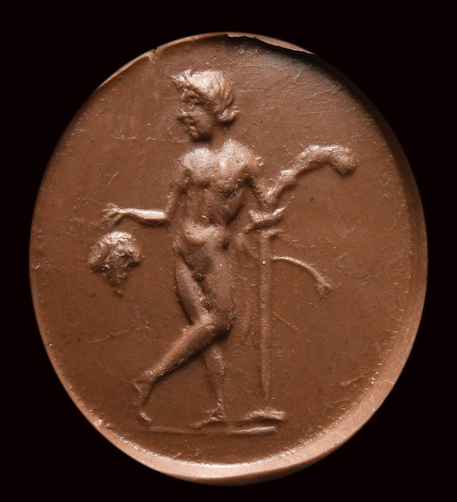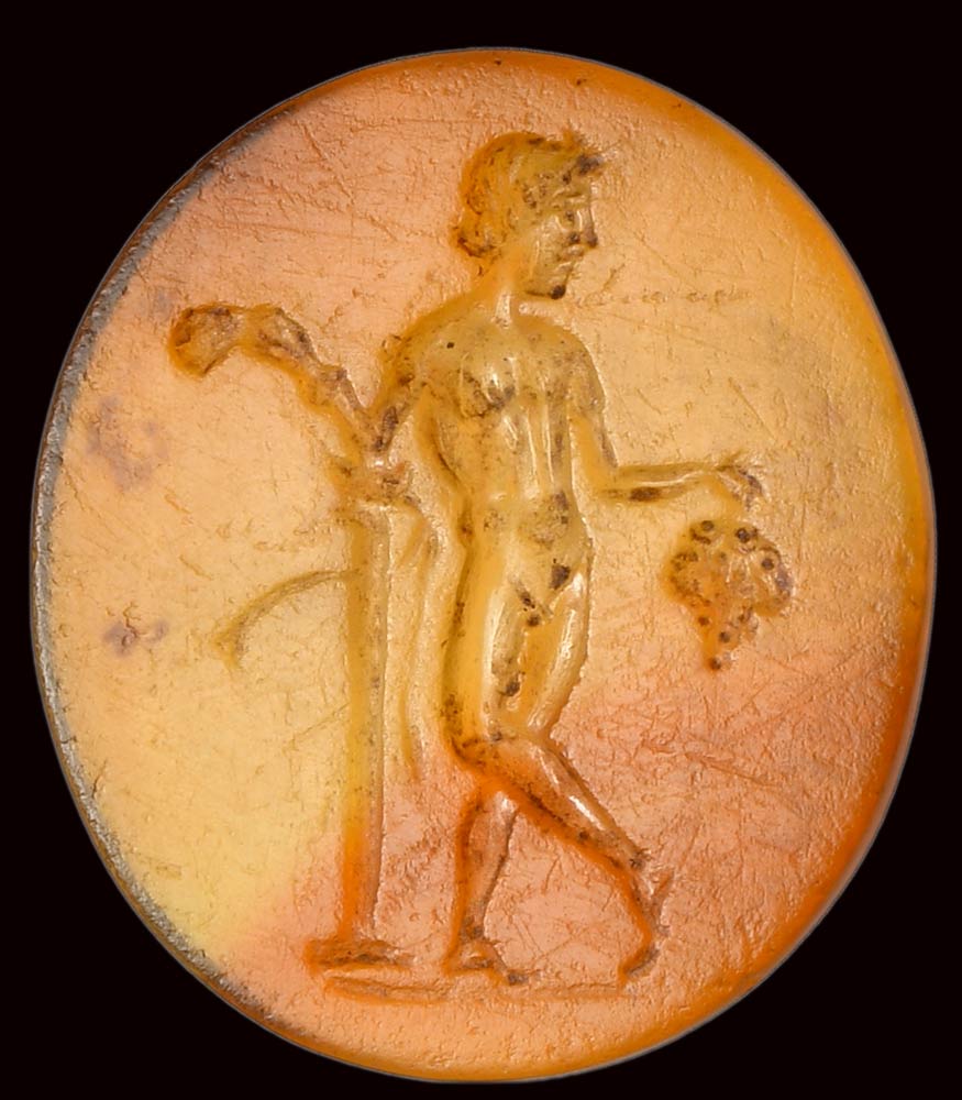 The young satyr is standing with crossed legs, elegantly leaning against a column. The figure, inspired by the hellenistic models, is slightly three-quarters while the head is in profile. With his right hand he holds ribbons and a very gnarled curved stick (pedum) while with his left a large bunch of grapes. Small groundline. The intaglio is done with great technical and artistic skill. The pose is elegant and soft in the modeling of the anatomy. Attractive variety of stone zoned between light yellow and orange. Wear marks.
