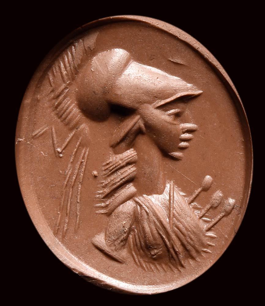 The helmated deity is turned to the left, wearing the egida. Slight wear marks and little trace of burning on the right.