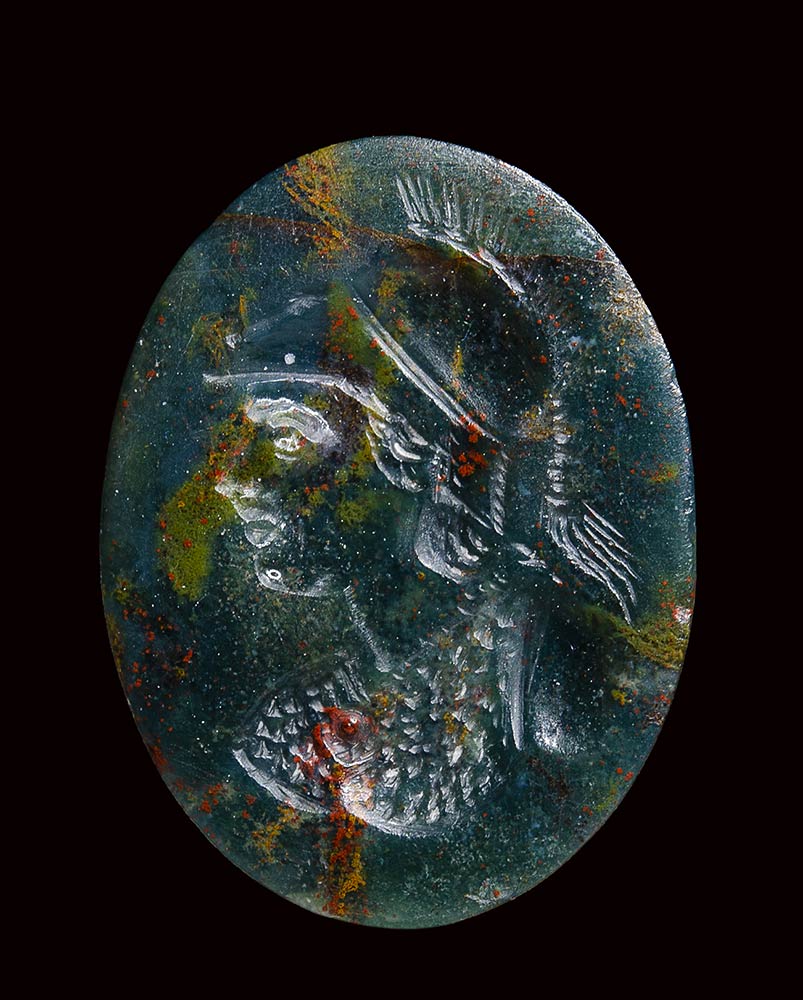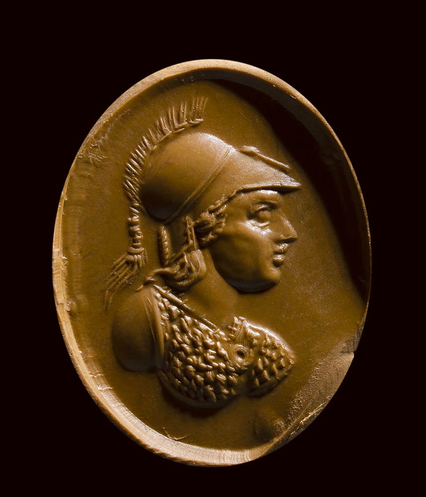 The helmeted divinity faces left and is depicted with a well-detailed bust decorated with a gorgoneion. Attractive variety of heliotrope, characterized by multi-colored inclusions. The stone is large in size and shows signs of wear on the entire surface.