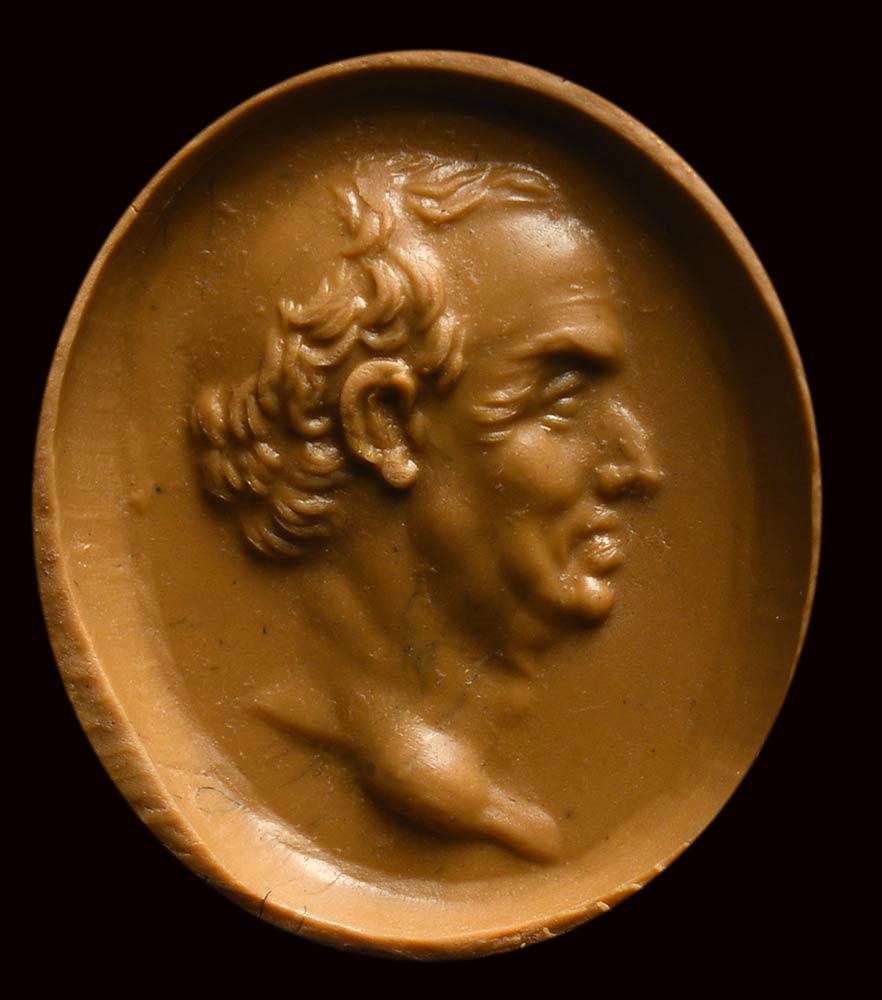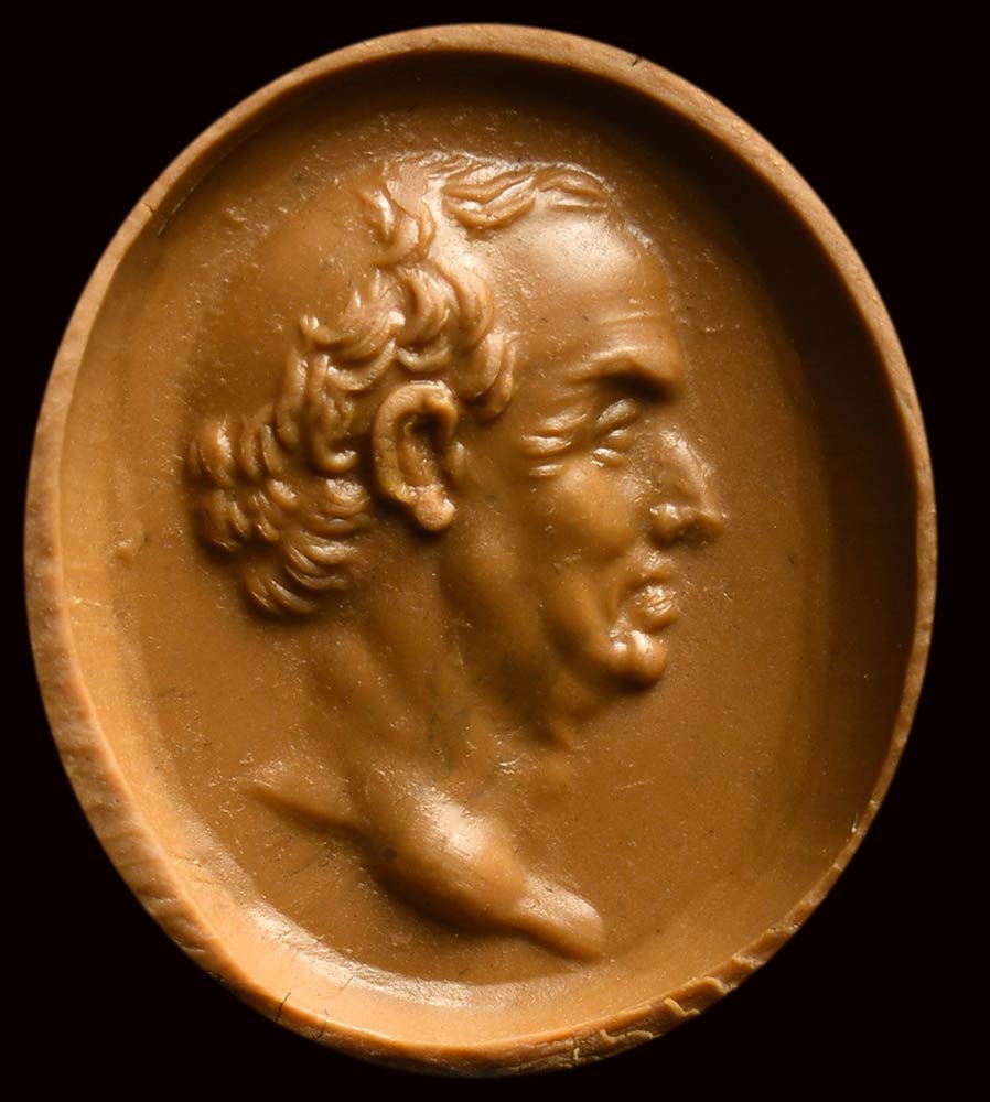 This fine portrait, facing left, is characterized by physiognomic details expertly engraved, referable to known models identifiable as portraits of the famous roman character. The naturalistic and expressive features of the face, which reveal an advanced age, are inspired by the late Republican portraits. Slight wear marks.