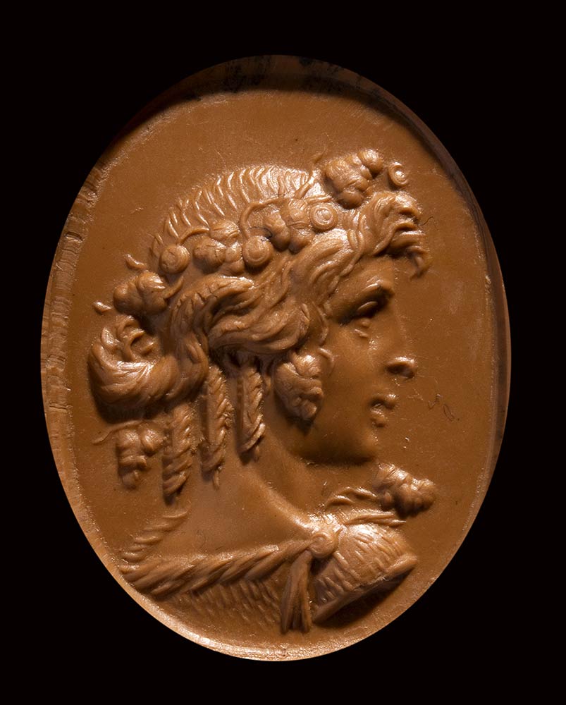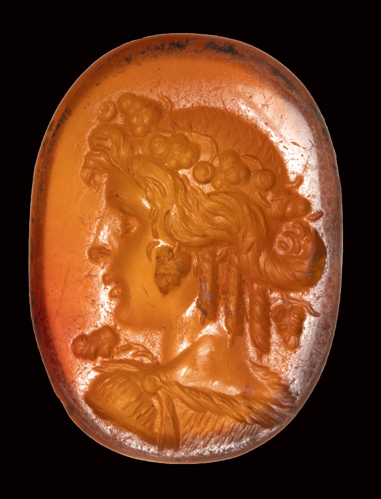 The figure is turned to the left, with the three-quarters bust seen from behind covered by a goat fur stopped by a round fibula on the shoulder; the head is in profile, with a thick and very detailed hair, decorated with small bunches of grapes and berries; braids descend on the neck. The face is characterized by a slightly sunken eye and a slightly open mouth, in the typical expressive rendering of late Hellenistic works. In this case it is a work referable to the Ptolemaic context and which presents a particularly close parallel with a carnelian intaglio of the Cabinet des Medailles, identified as a portrait of a Ptolemaic princess as a bacchante. Both carvings seem to come exactly from the same atelier. Wear marks.