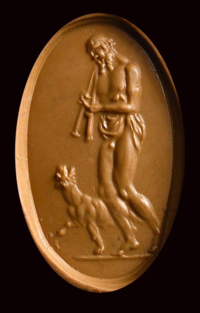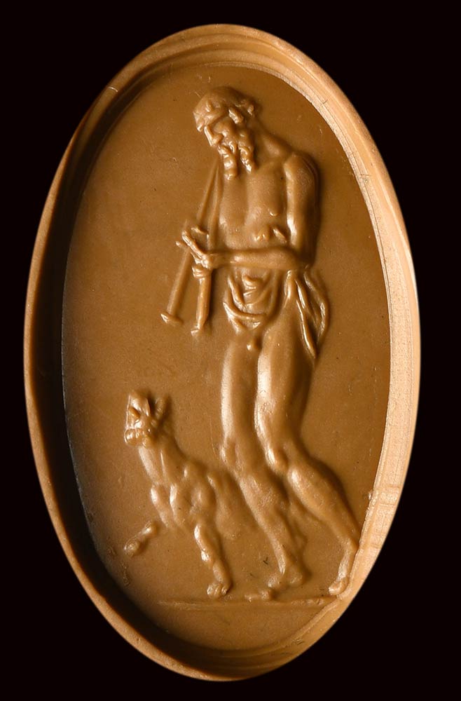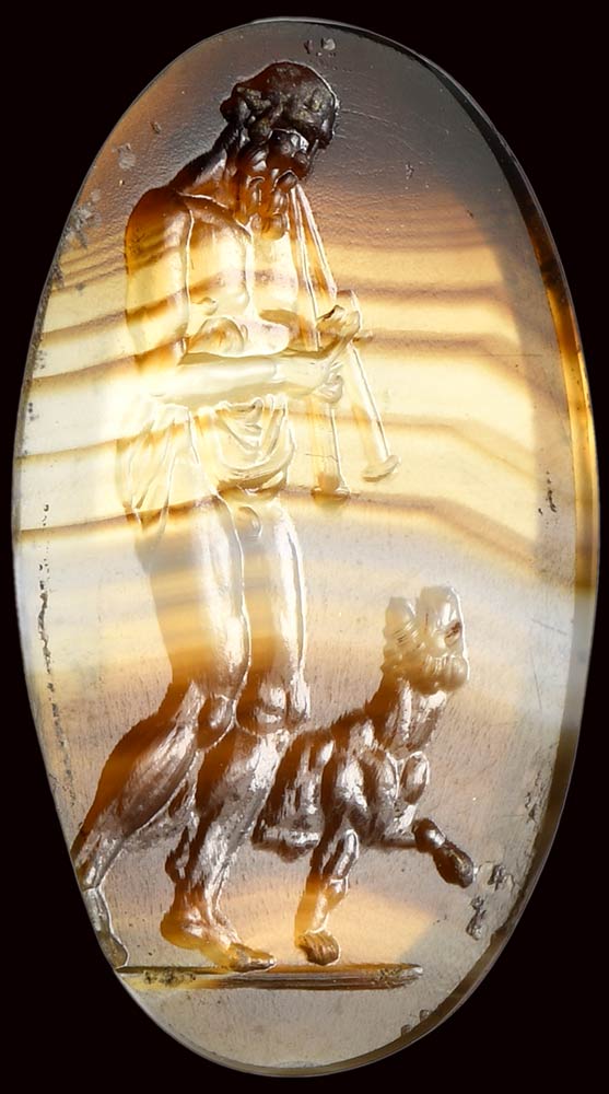The character is standing, facing right, in the act of playing the double flute. At his feet a panther, referring to Dionysus and the Bacchic processions, who follows him attached to his legs, looking towards the double flute, as if enchanted by the melody. Groundline. The anatomical details of Silenus and the panther's body are rendered with art and skill. Depiction inspired by classical statuary models. Mirror polishing. Slight wear marks. Attractive color of the stone.