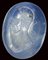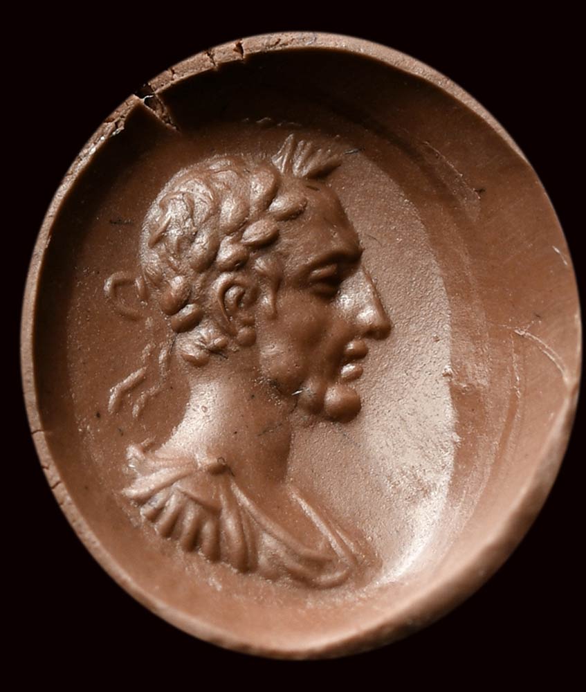 The bust of the roman dictator is turned to the left. The character wears the laurel wreath ending with ear of corns (egyptian symbol). He wears the armour under the chlamys. The face is characterized by his typical physiognomic marked traits, well executed considering the very small size and the particular hardness of this precious stone; the style is close to the globular style of the late republican period . Attractive stone color with various shades of blue. Convex surface on both sides of the stone. Wear marks. Rare.