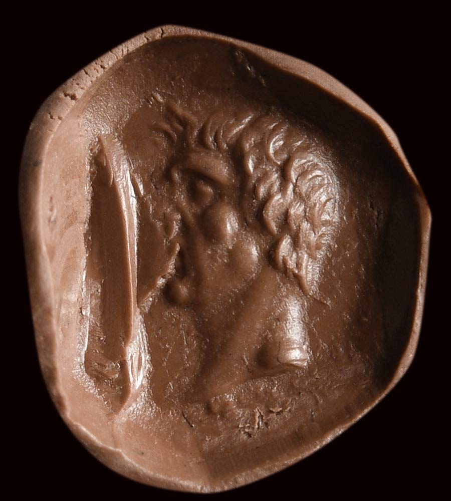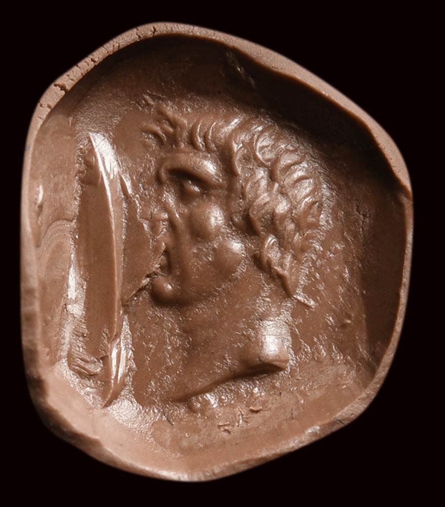 The portrait is facing right. The nose and part of the mouth are missing due to the breaking of the stone. However, the physiognomic features are well evident, such as the protruding cheekbone and the spherical chin, the folds on the cheek, the marked orbital arch, the musculature of the neck and above all the typical hair with overlapping strands with a characteristic raised tuft of hair on the front. These anatomical details, referable to the late republican iconography, make it probable that this effigy is identified with Pompey the Great, or a similar and coeval private portrait. The stone was later shaped on the back with facets, probably in the Renaissance period. However, the front side has retained its ancient wear marks. Rare.