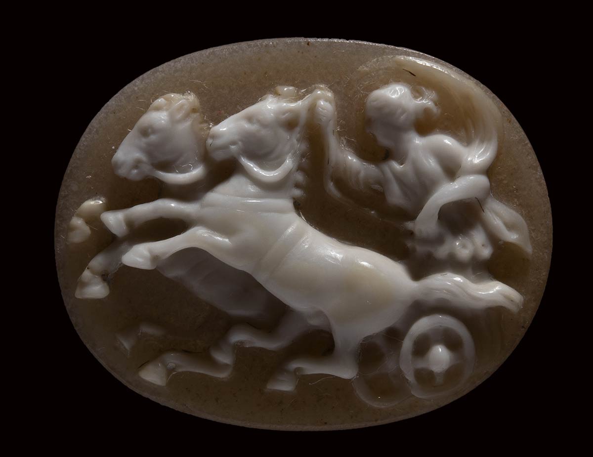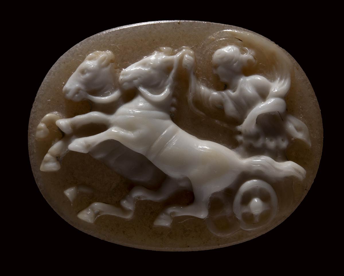 The figures are facing left. The goddess of Dawn wears a chiton with overfold, and an himation which is blown out behind her by the wind. She is driving a chariot with two galopping horses. She holds the bridles that hold the two horses in two hands. The two mighty animals raise their front legs. The figures are engraved on the white layer tending to the shade of ivory, on a honey-colored background with small brown inclusions. The cameo, of generous dimensions, is sculpted with fine skill in high relief. Slight wear marks. Rare.