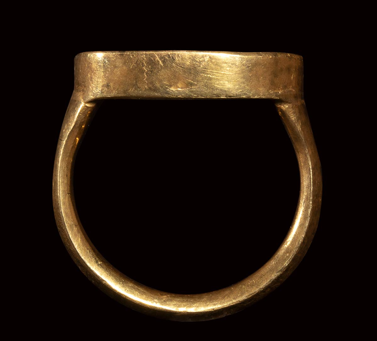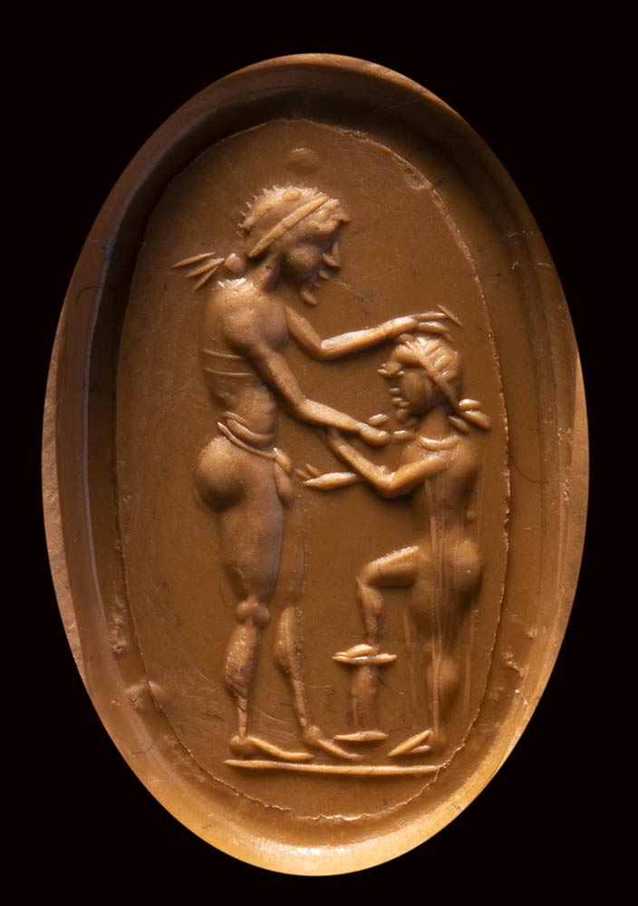 A young boy is depicted in an intimate moment of initiation into the greek paiderastia. The young figure wears a collar and a thin robe that glimpses his shapely naked body (veil) and is faced with an adult male figure, with a diademate head and a naked body. The man brings his hands to the boy's head, who puts his hand up to touch his attributes while keeping his left leg raised above a small altar. Groundline. Probable scene of initiation to homoerotic paideia; the scene seems inspired by the repertoire of Greek black-figured vascular painting. Very rare subject on gems. The ring seems to have a repair in the attack between the rod and the bezel. Wear marks.