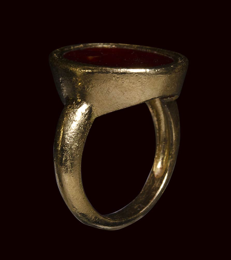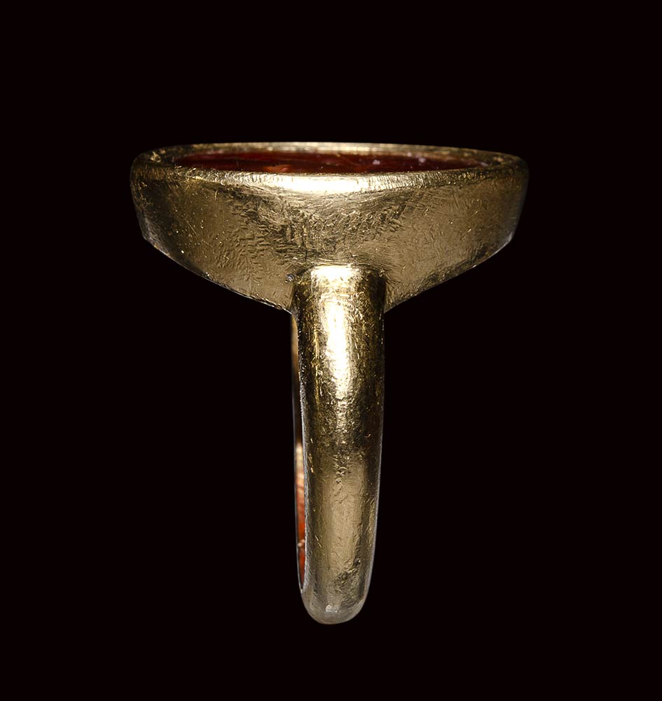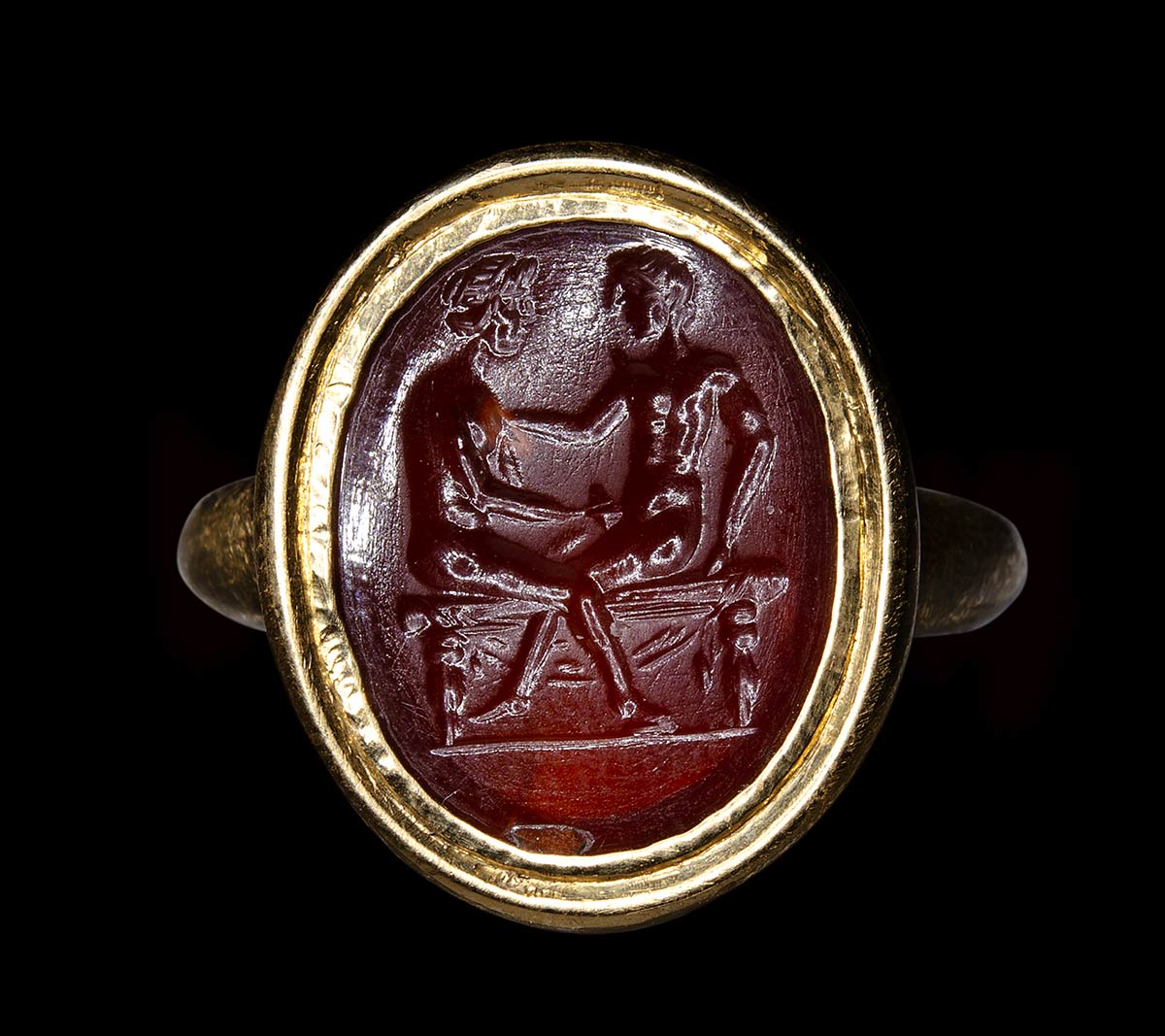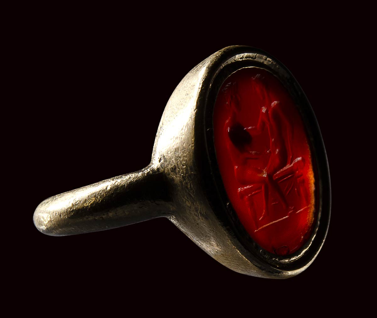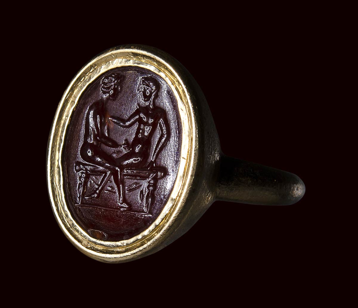 With a wide hoop rounded without and flatten within surmonted by a large rounded bezel set with a large carnelian intaglio. The scene depicts a man and a woman seated on a bed in front of each other in an act of masturbation. Groundline. The scene is strongly inspired by the depictions of sexual acts coined on the spintriae: the characteristic posture, the style of the figures and of the bed, the composition and the attitudes of the characters. Spintria (plural, spintriae), or more correctly erotic tessera, was the name of a particular category of Roman token, generally used for payments within a brothel. On it, usually, heterosexual erotic scenes are depicted. However, this intaglio is not a copy of spintria as mastrurbation scenes of this type do not seem to recur in the usual repertoire. Another source of inspiration are the frescoes of Pompeii and the terracotta oil lamps.The deep red color of the stone well emphasizes the strong erotic charge of the representation, and presents a small natural inclusion in a nodule exactly on the breast of the female figure, perhaps referable to an intimate auspicious and apotropaic meaning on the health of the owner of the gem. Mirror polishing inside the figures. Wear marks and a minor crack on the edge. Rare.