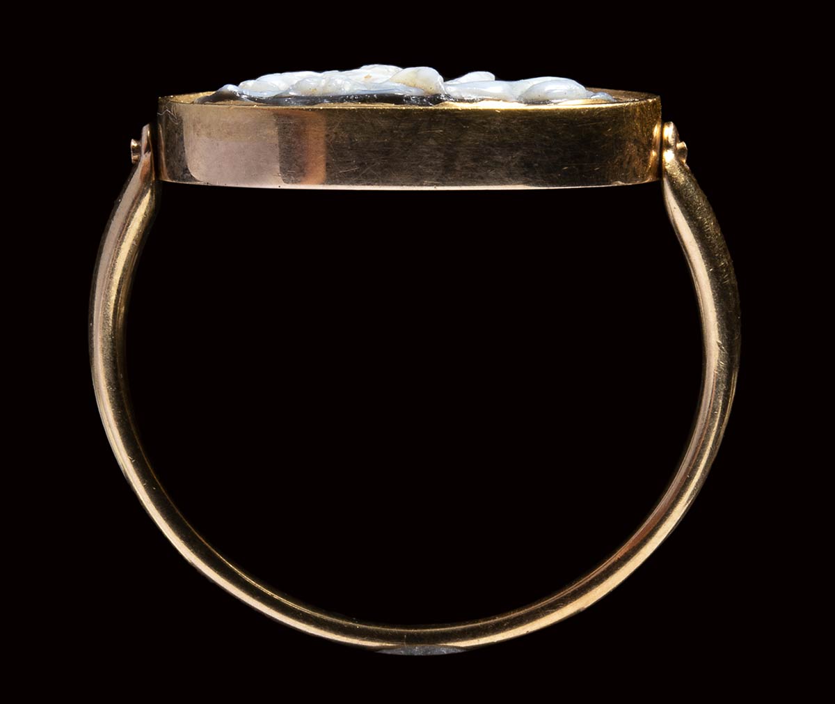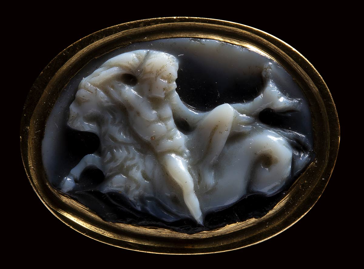 A naked youth riding a capricorn (goat-fish). He claps one of the creature's horns and is fishing with a rod, which curves as it catches a small fish. He is sitting on a hide with a serrated edge. An interesting parallel, very similar, is a refined sardonyx cameo from the Beverly collection (Alnick castle), dated 30 BC and identified as the young Octavian Augustus (whose zodiac sign was Capricorn) in the allegory of the victory of the naval battle of Actium (31 BC). The victory was in fact celebrated on the cameos. However, the figure also seems close to the models of the satyr-pan, as in this case, whose marked features of the face and youthful musculature seem to express. The cameo, mounted in a swivel gold ring, has damaged edges and the figure is missing a foot. The piece clearly shows signs of ancient wear and an ancient execution with marked and spontaneous engraver lines, certainly inspired by a precise model as for the Beverly cameo. Well composed scene. Interesting iconography. Rare.
