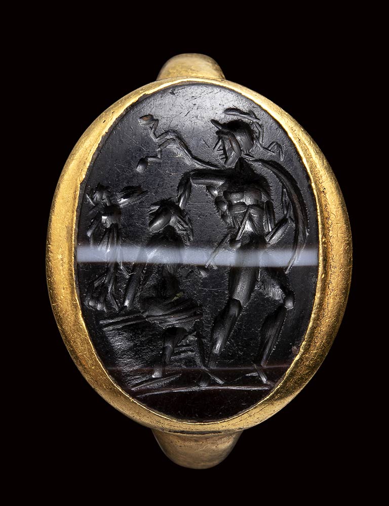 A roman banded agate intaglio set in a gold ring. Ajax with Cassandra.