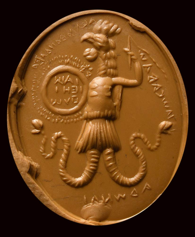 On top, on the right of the cock head, a palindrome ΑΒΛΑΝΑΘΑΝΑΛΒΑ̣ -> Ablanathanalba.