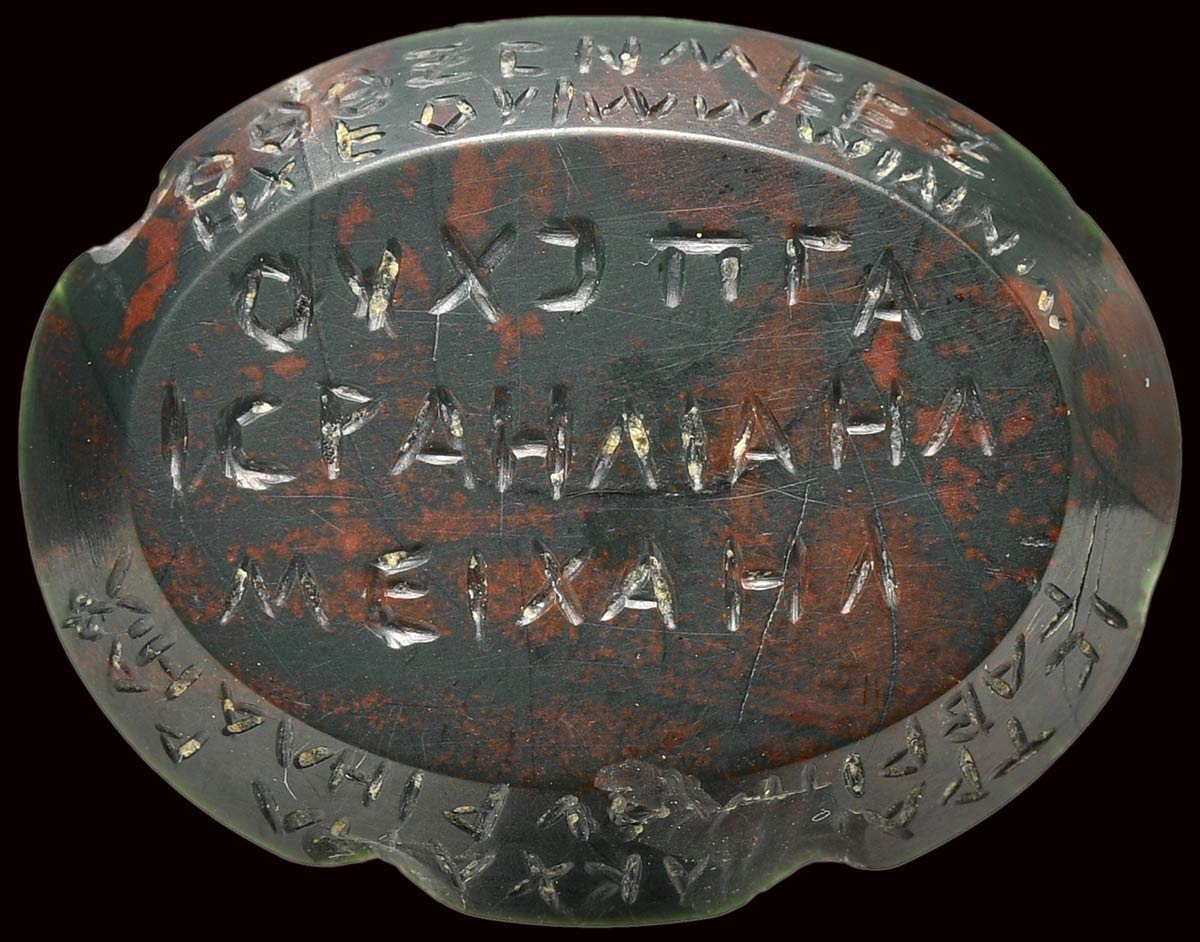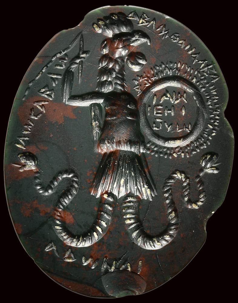 A fine roman green and red jasper magical intaglio. Anguipes with inscriptions.