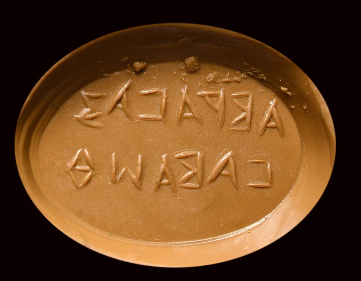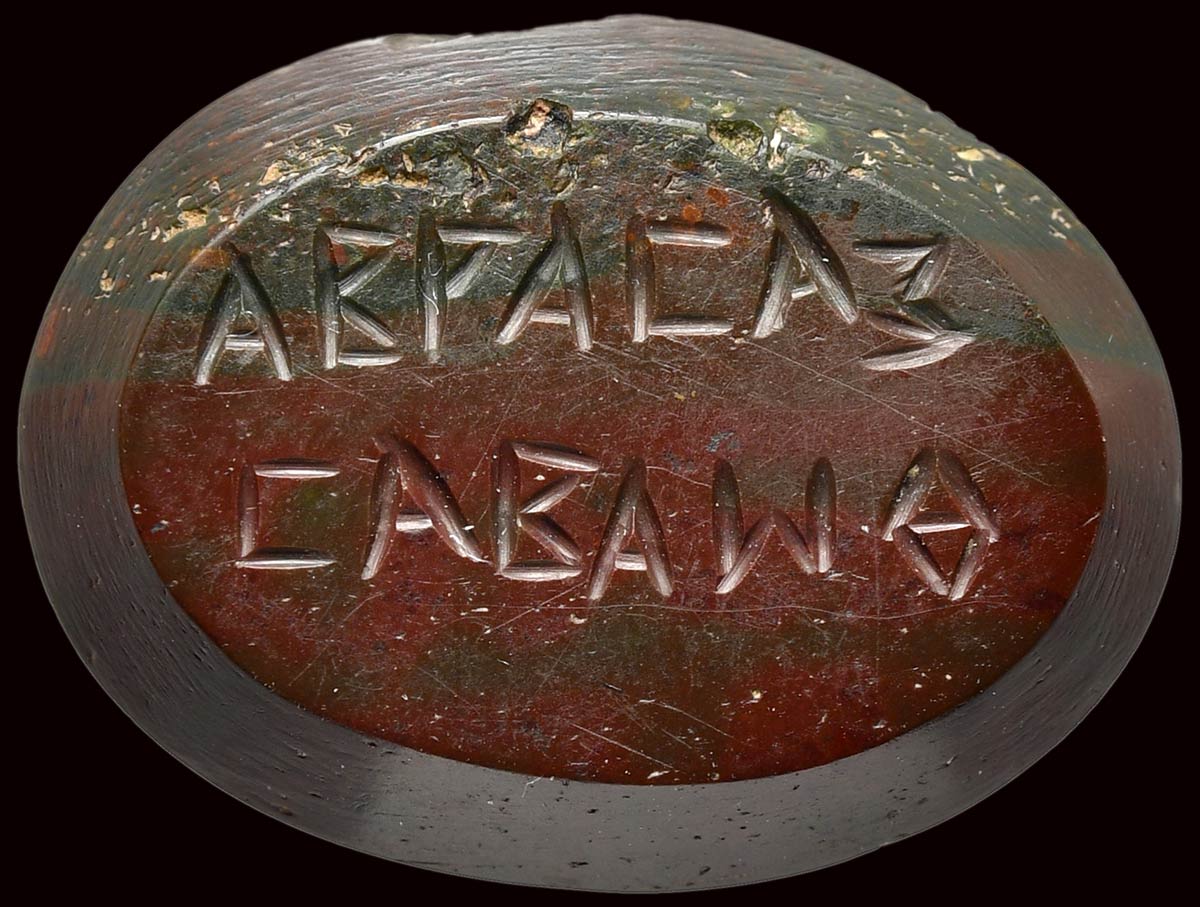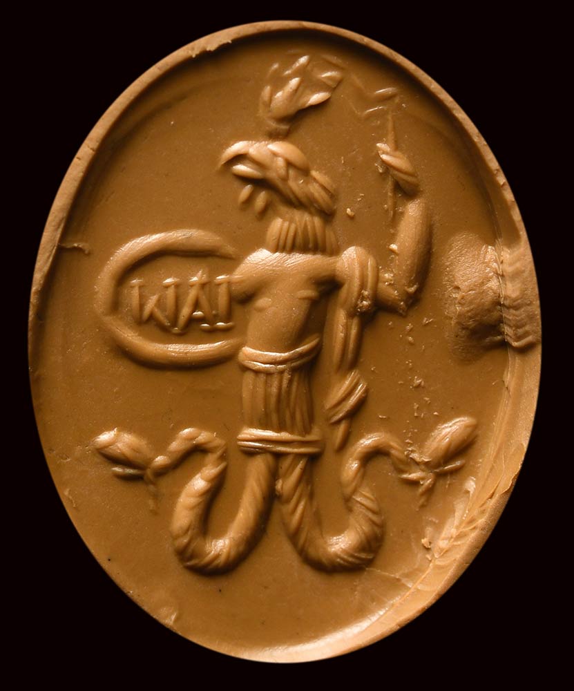The hybrid figure is turned on the right. The right hand raised high and holding the solar whip, left hand holding the round shield which is inscribed Ἰάω. On the reverse, two inscribed lines ABPACAZ - CABAωθ (Abraxas, Sabaoth).